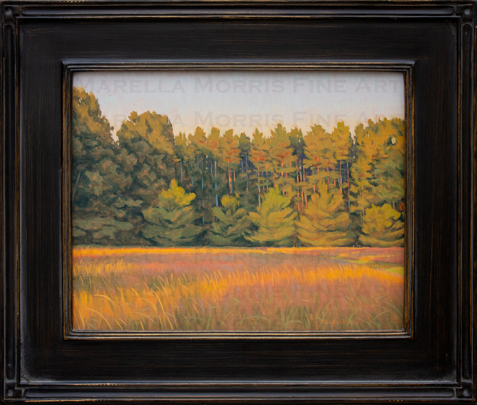 11 x 14 inch oil on gessoed hardboard. Finished in 3 inch dark hardwood frame with gold lip.