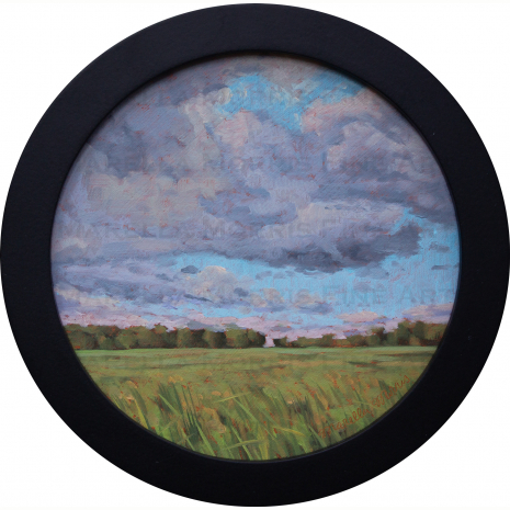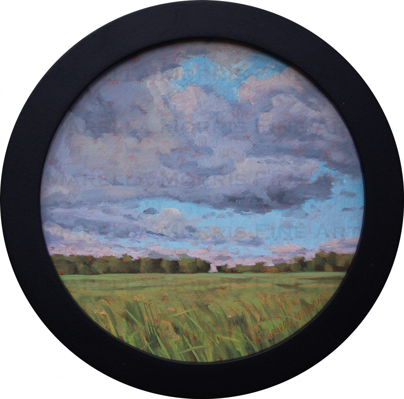 5 inch round oil on gessoed hardboard. Finished in 1/2 inch matte black frame.