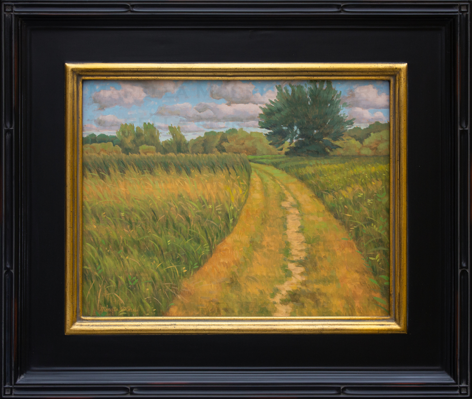 11 x 14 inch oil on gessoed hardboard. Finished in 3 inch dark hardwood frame with gold lip.